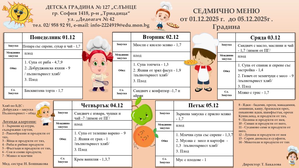 СЕДМИЧНО МЕНЮ – 01.12.2025 г. до 05.12.2025 г. Седмичното меню се поставя в понеделник на информационните табла за родители, във всички сгради на ДГ № 127 ”Слънце”. Менюто се изготвя от главния готвач, медицинските сестри и домакина на детското заведение. Одобрява се от директора. Храненето на децата е съобразено с: Наредба № 6 от 10.08.2011г. За здравословно хранене на децата на възраст от 3 до 7 години в детски заведения / в сила от 15.09.2011г./ на Министерство на Здравеопазването, Наредба № 9 от 16.09.2011г. За специфичните изисквания към безопасността и качеството на храните предлагани в детските заведения и училищата /в сила от 20.10.2011г./ – на Министерство на Земеделието и храните. Ежедневно храната за децата се приготвя в модерна кухня, отговаряща на съвременните изисквания на НАССР системата.