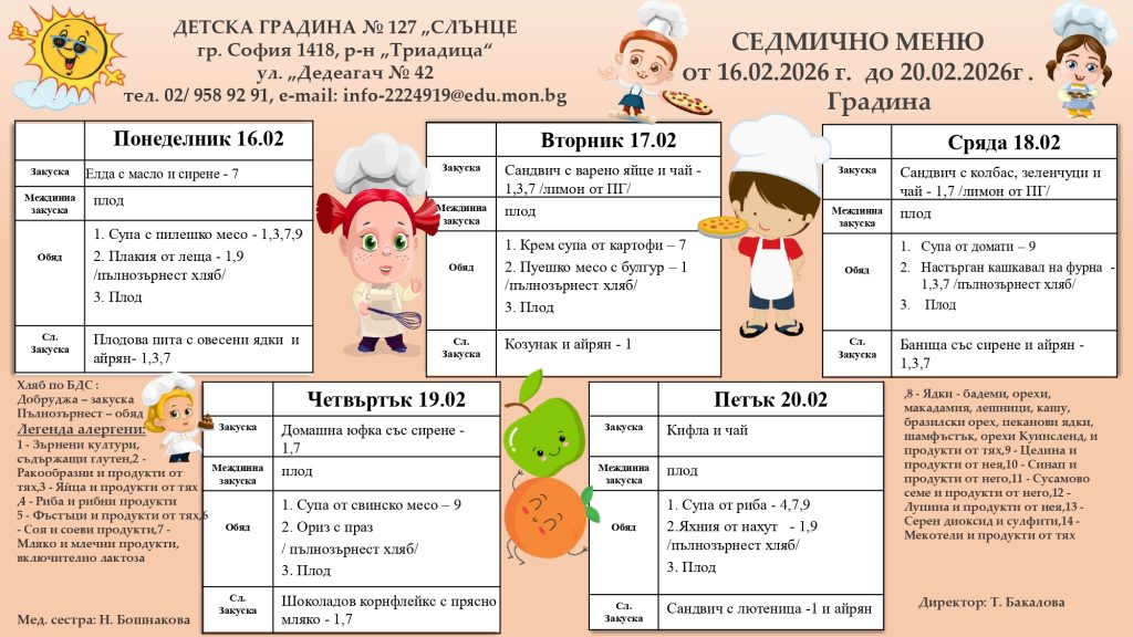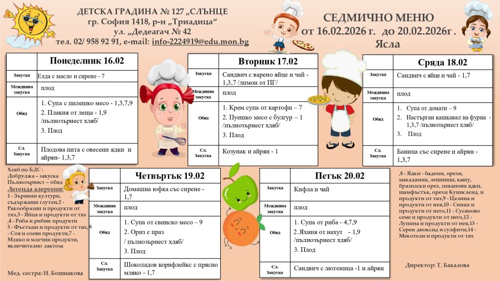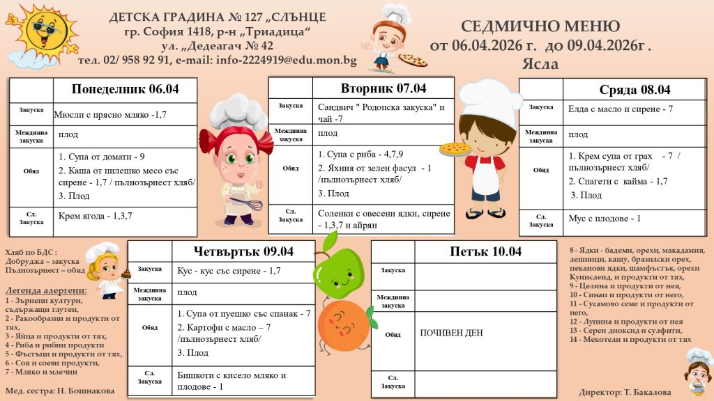 СЕДМИЧНО МЕНЮ – 06.04.2026 г. до 10.04.2026 г. Седмичното меню се поставя в понеделник на информационните табла за родители, във всички сгради на ДГ № 127 ”Слънце”. Менюто се изготвя от главния готвач, медицинските сестри и домакина на детското заведение. Одобрява се от директора. Храненето на децата е съобразено с: Наредба № 6 от 10.08.2011г. За здравословно хранене на децата на възраст от 3 до 7 години в детски заведения / в сила от 15.09.2011г./ на Министерство на Здравеопазването, Наредба № 9 от 16.09.2011г. За специфичните изисквания към безопасността и качеството на храните предлагани в детските заведения и училищата /в сила от 20.10.2011г./ – на Министерство на Земеделието и храните. Ежедневно храната за децата се приготвя в модерна кухня, отговаряща на съвременните изисквания на НАССР системата.