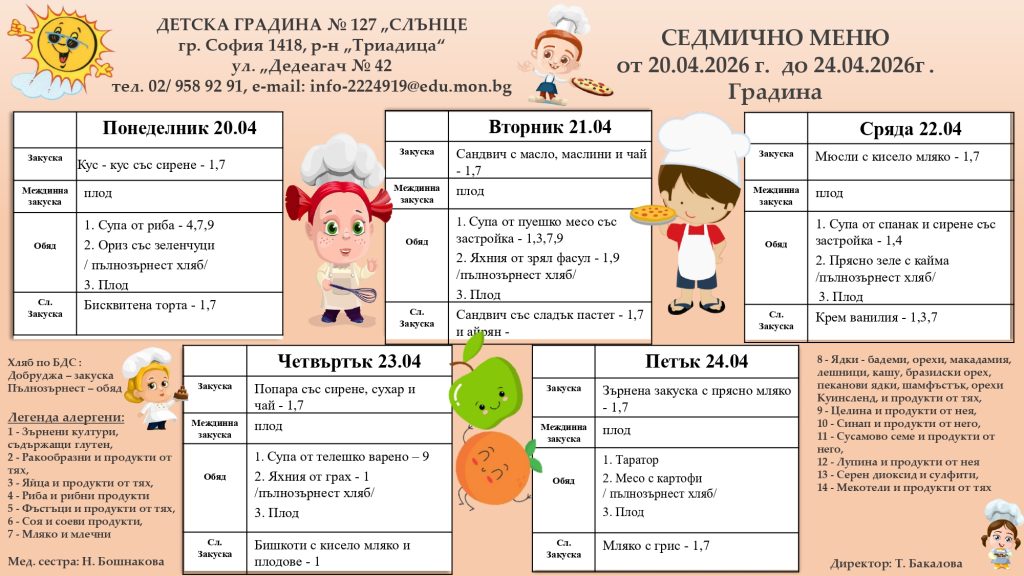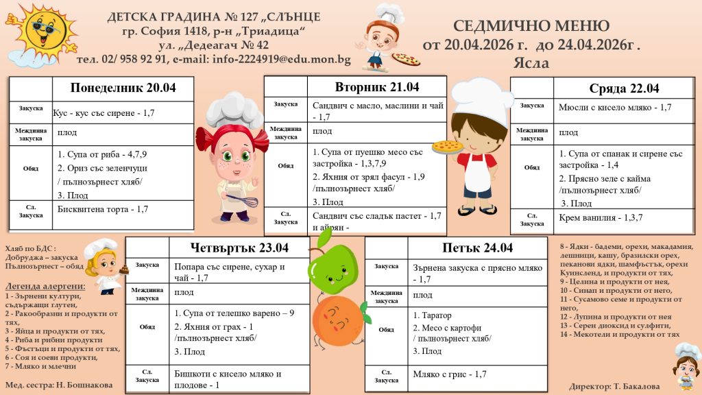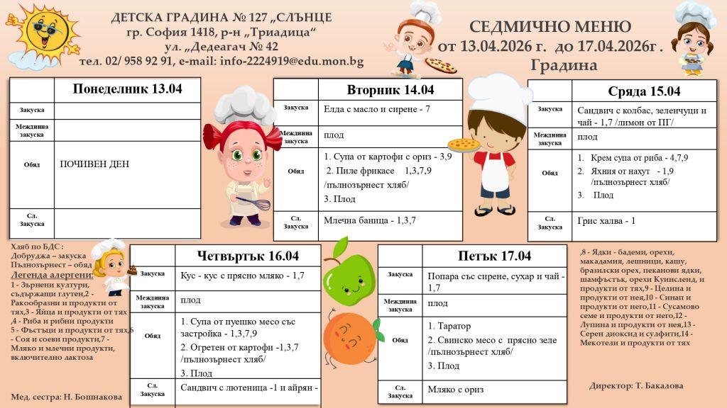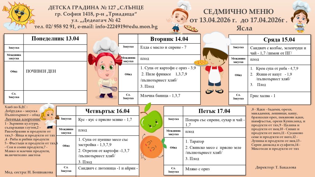 СЕДМИЧНО МЕНЮ – 13.04.2026 г. до 17.04.2026 г. Седмичното меню се поставя в понеделник на информационните табла за родители, във всички сгради на ДГ № 127 ”Слънце”. Менюто се изготвя от главния готвач, медицинските сестри и домакина на детското заведение. Одобрява се от директора. Храненето на децата е съобразено с: Наредба № 6 от 10.08.2011г. За здравословно хранене на децата на възраст от 3 до 7 години в детски заведения / в сила от 15.09.2011г./ на Министерство на Здравеопазването, Наредба № 9 от 16.09.2011г. За специфичните изисквания към безопасността и качеството на храните предлагани в детските заведения и училищата /в сила от 20.10.2011г./ – на Министерство на Земеделието и храните. Ежедневно храната за децата се приготвя в модерна кухня, отговаряща на съвременните изисквания на НАССР системата.