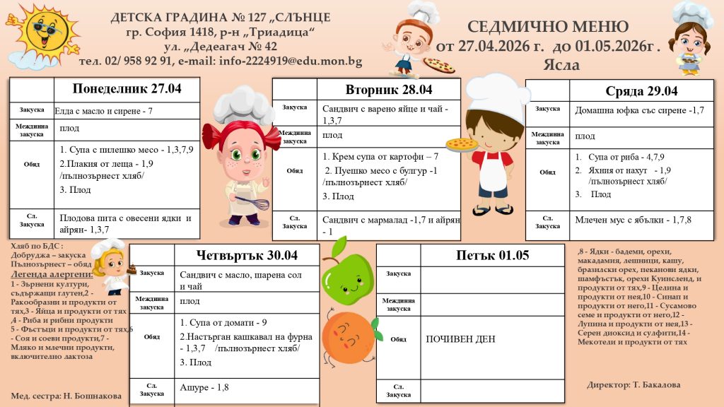 СЕДМИЧНО МЕНЮ – 20.04.2026 г. до 24.04.2026 г. Седмичното меню се поставя в понеделник на информационните табла за родители, във всички сгради на ДГ № 127 ”Слънце”. Менюто се изготвя от главния готвач, медицинските сестри и домакина на детското заведение. Одобрява се от директора. Храненето на децата е съобразено с: Наредба № 6 от 10.08.2011г. За здравословно хранене на децата на възраст от 3 до 7 години в детски заведения / в сила от 15.09.2011г./ на Министерство на Здравеопазването, Наредба № 9 от 16.09.2011г. За специфичните изисквания към безопасността и качеството на храните предлагани в детските заведения и училищата /в сила от 20.10.2011г./ – на Министерство на Земеделието и храните. Ежедневно храната за децата се приготвя в модерна кухня, отговаряща на съвременните изисквания на НАССР системата.